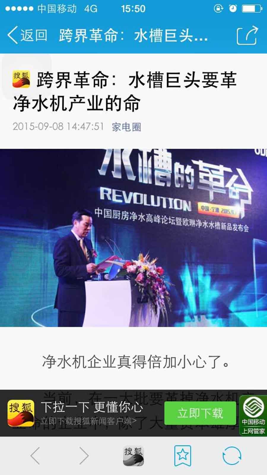 今日頭條、網(wǎng)易、鳳凰、搜狐等近百家門戶、行業(yè)類網(wǎng)站進(jìn)行轉(zhuǎn)發(fā)、報(bào)道,《中國(guó)家電網(wǎng)》就發(fā)文表示:“一個(gè)傳統(tǒng)家裝行業(yè)企業(yè),將凈水技術(shù)做到如此極致,所謂的‘家庭凈水在廚房,廚房?jī)羲谒郏蹆羲跉W琳’,傳統(tǒng)的臺(tái)下凈水,你們可感受到危機(jī)?水槽發(fā)明者再次發(fā)明水槽!這,就是革命!”