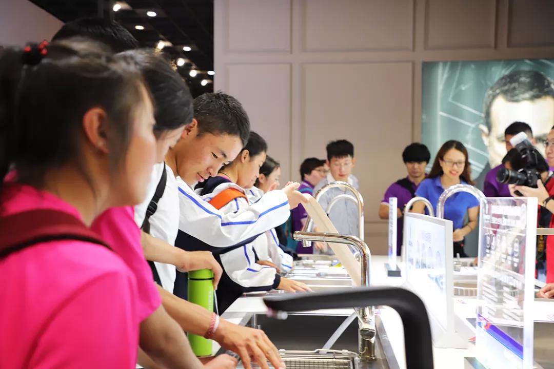 格桑花師生們?cè)诠ぷ魅藛T的帶領(lǐng)下首先參觀了歐琳智能美學(xué)廚房展廳,了解歐琳廚房發(fā)展史,體驗(yàn)了不怕油的大吸力油煙機(jī) 等“黑科技”產(chǎn)品,參觀了包括 歐琳T系廚房 在內(nèi)的多款智能廚房。